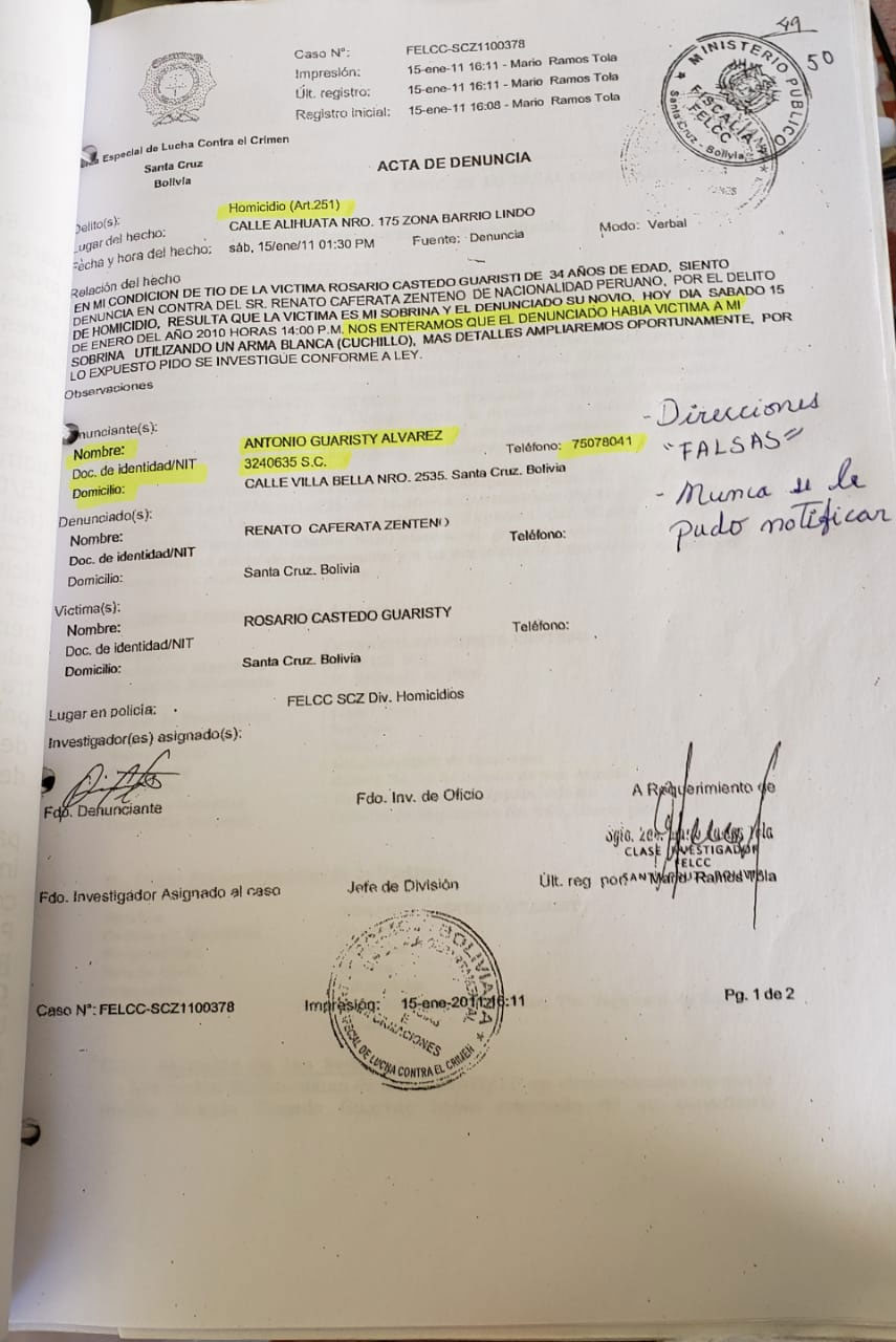TODOS LOS CASOS PENALES O CIVILES TIENEN UN INICIO, EN MI CASO EL 15 DE ENERO 2011, MI HIJO FUE SEÑALADO, POR GENTE EXTRAÑA, FAMILIARES CASTEDO GUARISTY, Y FUE SUFICIENTE PARA GENERAR UN INDEBIDO PROCESO, RENATTO JAMAS FUE ESCUCHADO Y NUNCA LA FISCALIA ACEPTO QUE SE HAGA UNA INVESTIGACION SOBRE LAS PETICIONES QUE SOLICITABA MI ABOGADO....ESO SE LLAMA UN INDEBIDO PROCESO, DESESTIMAR LOS HECHOS DEL CASO