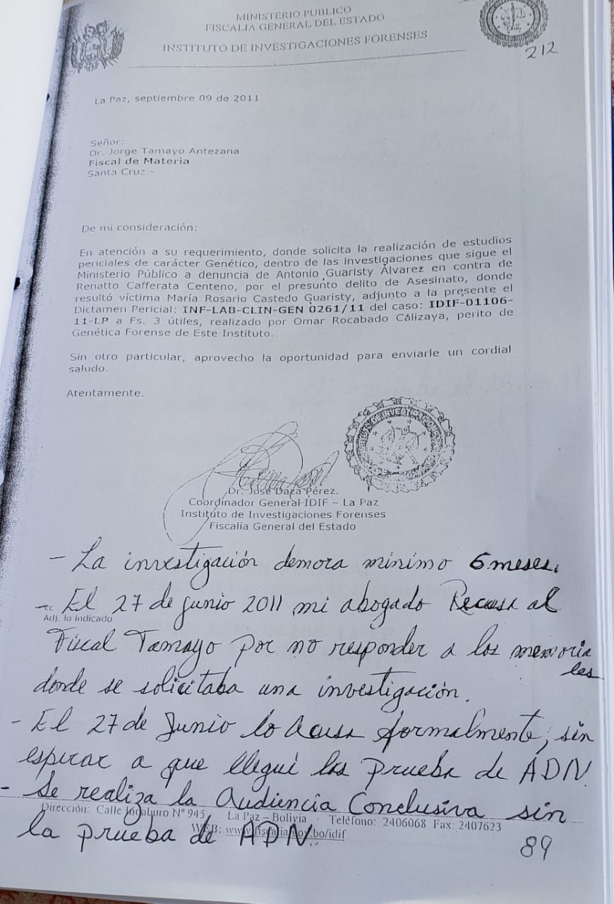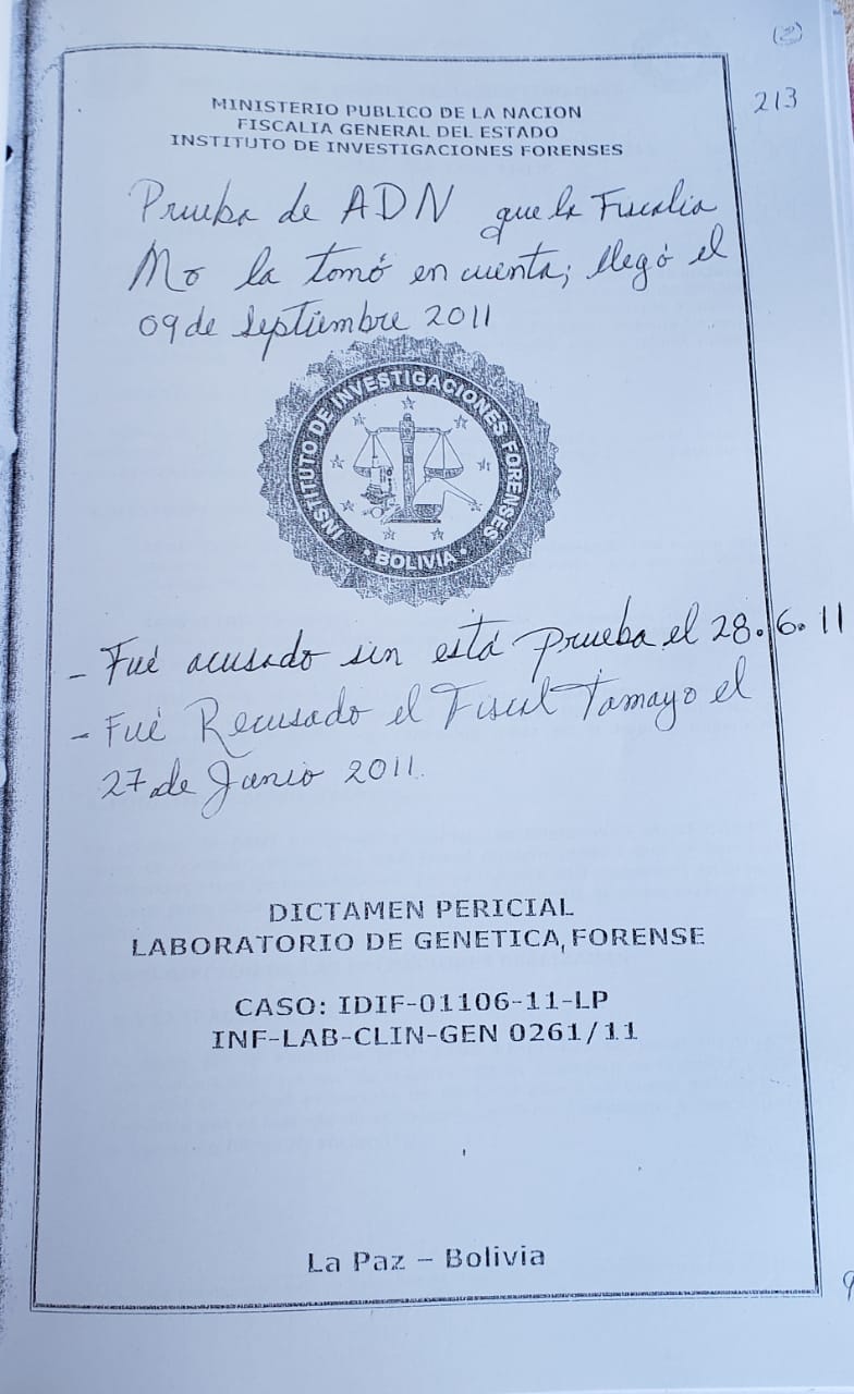 Las vulneraciones de derechos humanos que se cometieron en este juicio injusto, pruebas no aceptadas por el Ministerio Público de Bolivia como: Prueba del cuchillo NEGATIVO. Prueba de ADN NEGATIVO. Pertenencias sin sangre.