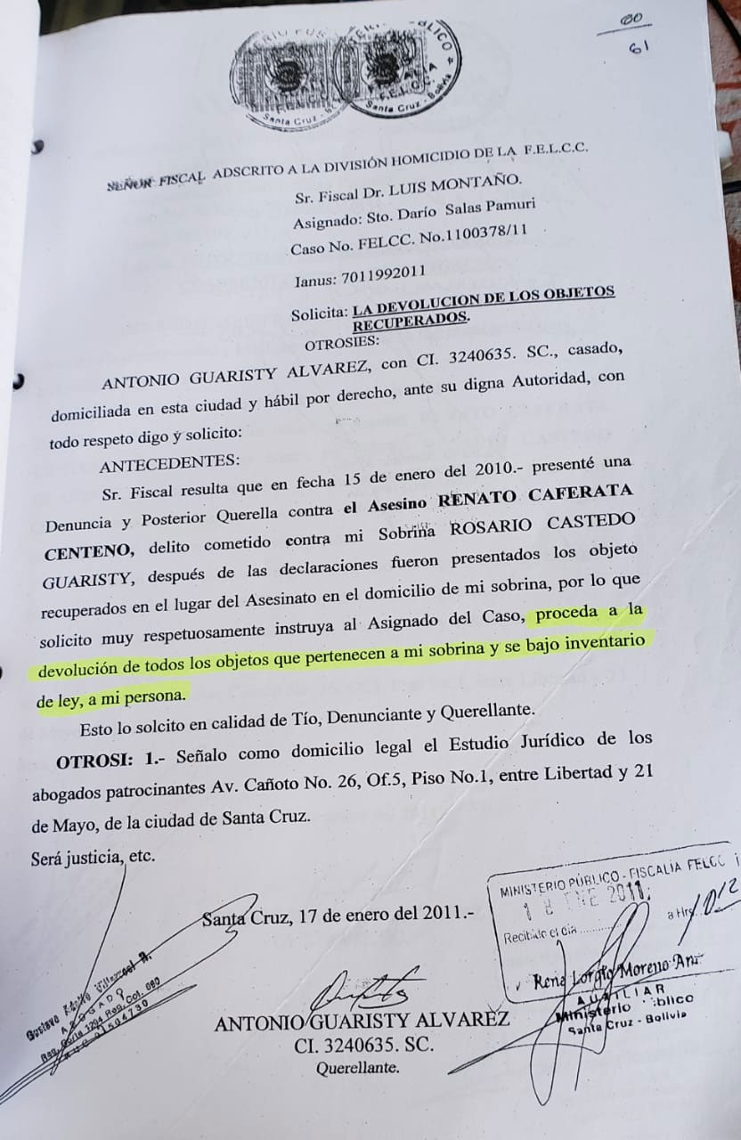 LA FISCALIA DEPARTAMENTAL EN LA INCAUTACIÓN DEL 15 DE ENERO DE 2011 SE QUEDA CON TODA LA DOCUMENTACIÓN ORIGINAL DE RENATTO, MIGRACIONES HACE DESAPARECER EL REGISTRO DE LA CEDULA DE IDENTIDAD Y EL SEGIP ELIMINA LOS REGISTROS, DESPUES DE 12 AÑOS, RECIEN RESPONDE EL TRIBUNAL CONSTITUCIONAL PLURINACIONAL AL AMPARO CONSTITUCIONAL CON FECHA 05 de Agosto 2022.